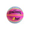 The Spalding NBA 4 her basketball has a feminine design with pink elements and offers a rubber cover for added durability. The ball is suitable for outdoor use and available in size 6.