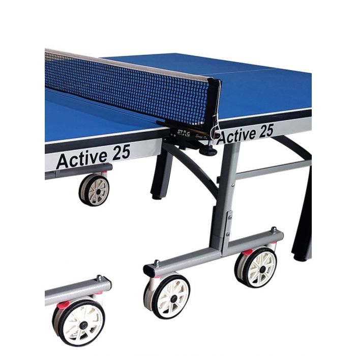 Stag Active 25 Table Tennis Table features Playback mode to play solo! Users need only to unfold the other of the two tables to start training without partner. Requires only seven minutes to get it assembled, the TT table is easy to store as well. The DuPont polyurethane anti-glare paint favours long lasting durability and facilitates easy and consistent bounce.